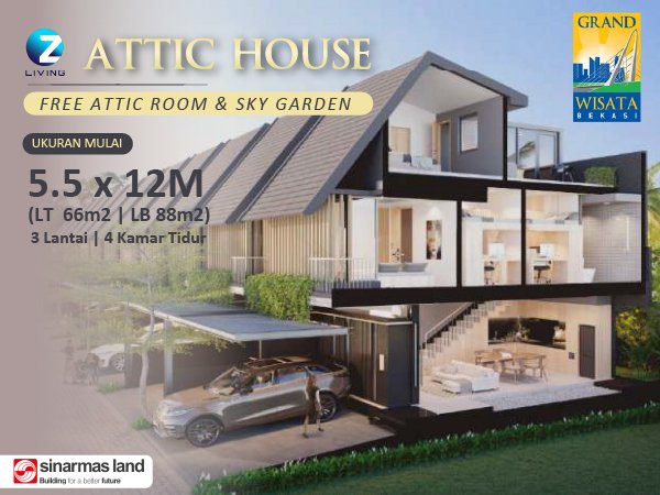 Salah satu cluster terbaru di pusat Bekasi adalah Attic House Z Living. Tipe Attic House Z Living Grand Wisata Bekasi merupakan tipe rumah terbaru di Grand Wisata Bekasi yang mengusung konsep hunian modern dengan target pasar generasi milenial. Dibangun oleh developer Sinarmas Land, Attic House Z Living dipasarkan dengan harga mulai dari Rp 1,6 M-an.